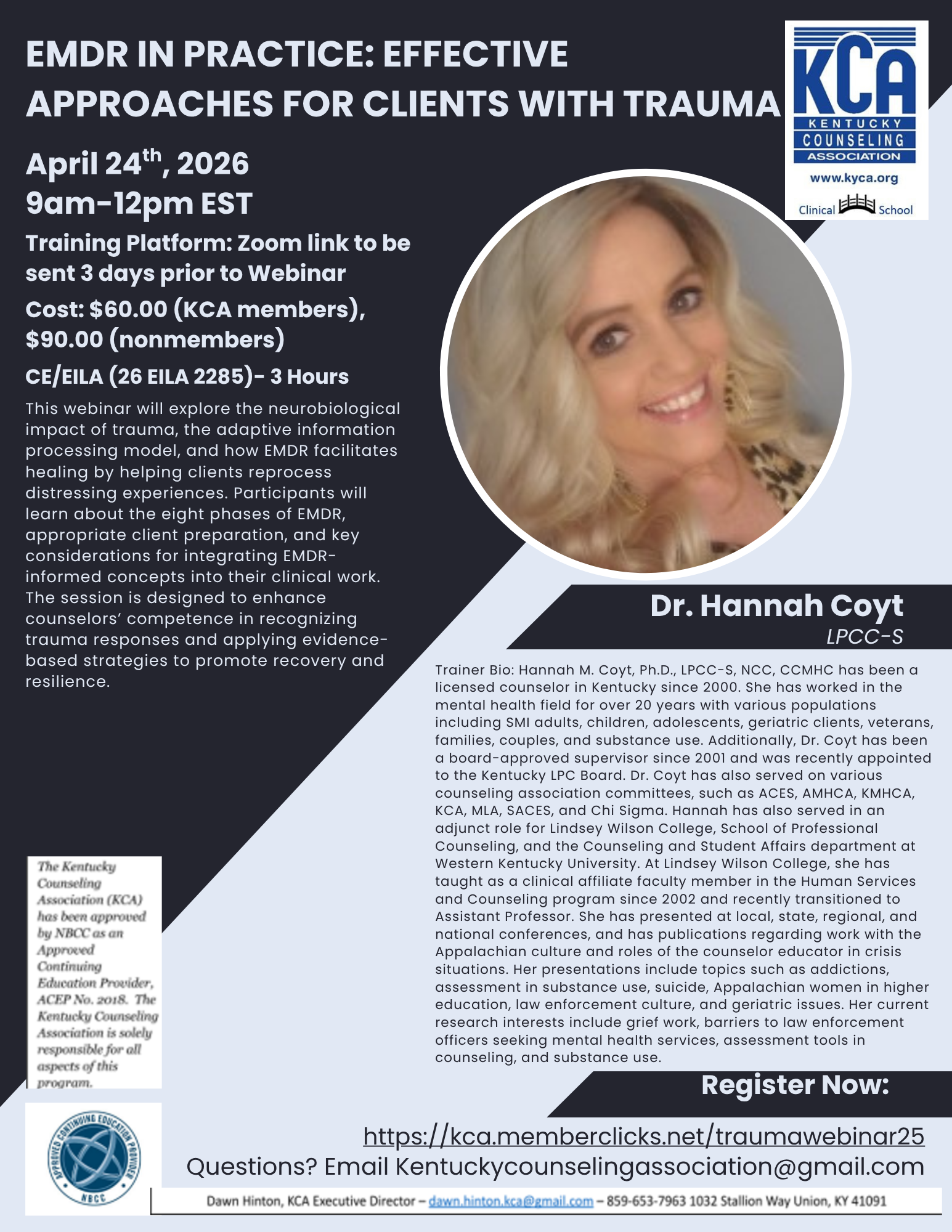 KCA is pleased to host this 3 hour Webinar EMDR in Practice: Effective Approaches for Clients with Trauma with Dr. Hannah Coyt On April 24th, 2026 from 9am-12pm EST.